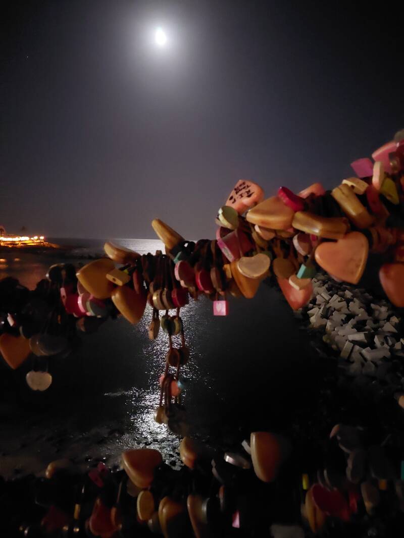 De dag verliep relaxter en 's middags maakten we het plan om vroeg te gaan eten en dan terug naar het dorpje te gaan. Nu mèt mondkapje zodat we de toeristische souvenirwinkeltjes konden binnenvallen. Ik vertelde de kinderen dat ik ons slotje meenam en dat wilde bevestigen. We slenteren over de boulevard, kopen wat souvenirs en na wat gezever over saaiheid komen we bij de plekjes die ook Dana en Gijs van de vorige keer herkennen. We maken een replica van één van de foto's van 2 jaar terug en komen aan bij het bunkertje. Daar worden de Dana en Gijs vervelend en lacherig. Ik herken hun "we geven een houding aan onze ongemakkelijkheid" en vertel ze dat ik het vervelend vind. Dat ze het niet belangrijk hoeven te vinden zoals ik, maar dat ze wel mogen accepteren dat het voor mij belangrijk is. Ik zeg ze dat ze maar op het strand moeten spelen, dat ik dit wel zelf doe. Ik kies een plekje, word opgejaagd door een familie (compleet, rot op, jullie hebben geen idee wat ik aan het doen ben) die graag foto's wil maken van de maan boven de zee... Eerlijk? Ik begrijp het, ze kunnen het niet weten, maar f*ck them, ik laat me niet opjagen...